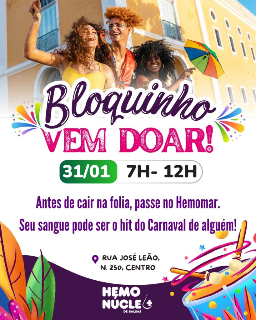 BLOQUINHO VEM DOARHemomar de Balsas vai fazer plantão neste sábado para aumentar o estoque de sangue no Carnaval